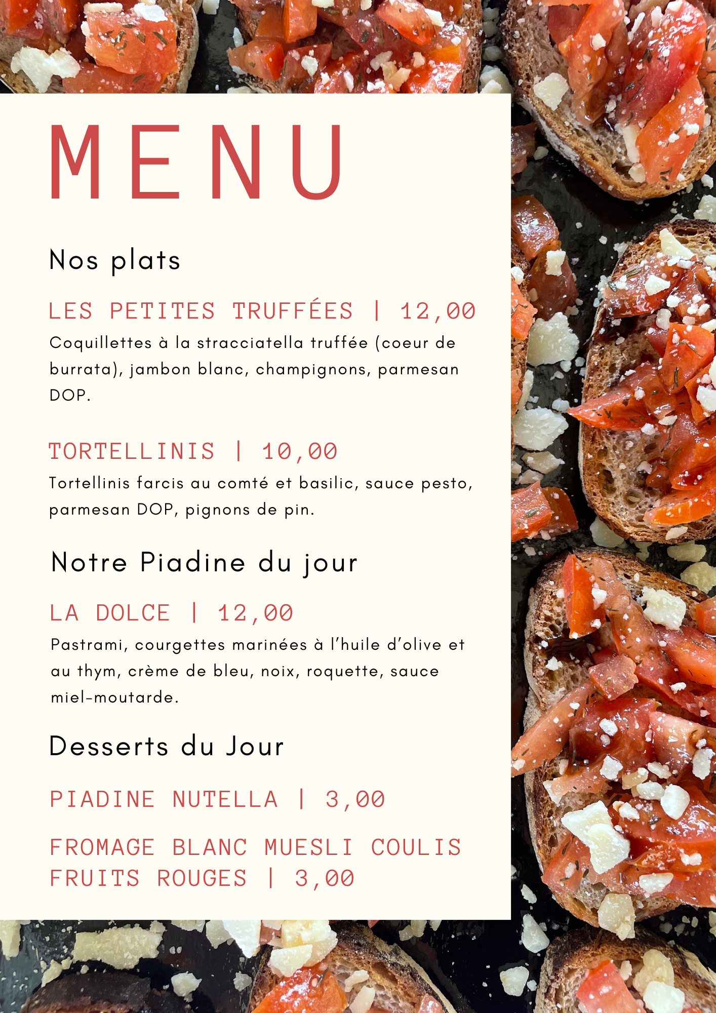 Toutes nos recettes sont préparées à base de produits frais de saisons et tout est fait maison.